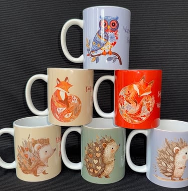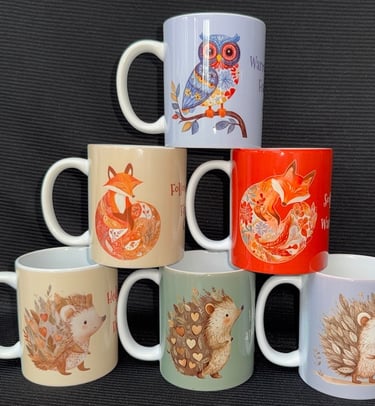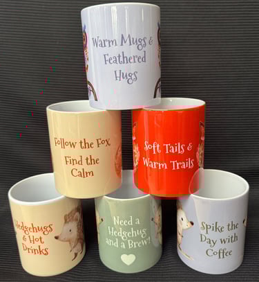 Wildlife themed 11oz china mugs with white interior and handle. Check out the catalogue for all the options - see above. The mugs are dishwasher safe.