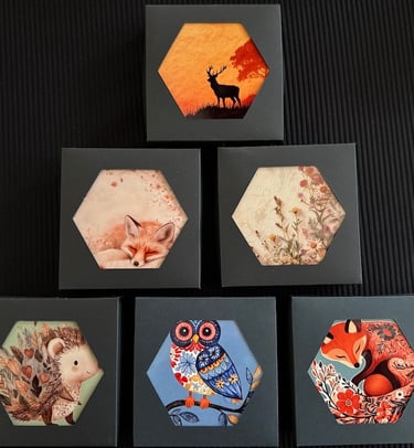 Wildlife themed coasters, 9cm x 9cm square, high quality surface with a cork backing, sold in a pack of 4 different designs in a black gift box (see right).